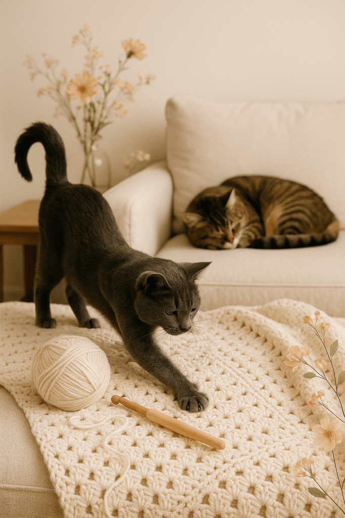 When the day winds down, you’ll find me with yarn in my hands, a nice cup of Lady Grey tea, and Merida and Eddy, my two cats, supervising every stitch (or at least pretending to).